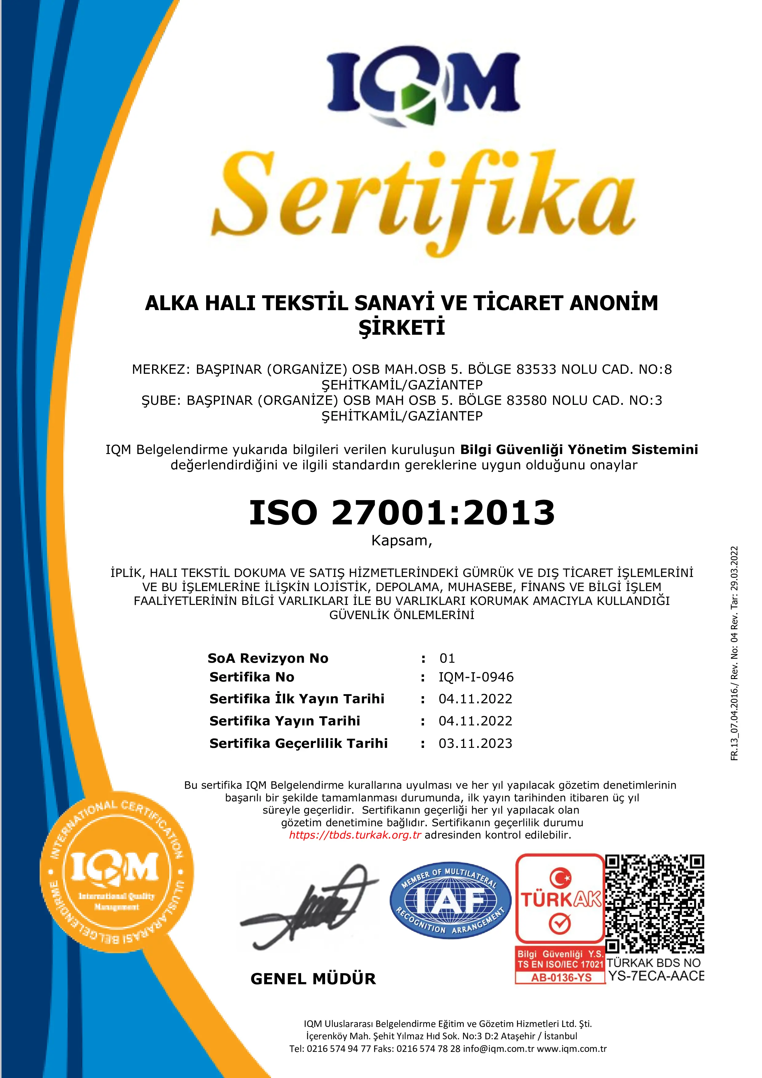 Bilgi varlıklarının iş süreçleri ve fonksiyonları için çok önemli olduğunun bilinci ile; Bilgi varlıklarının gizliliğinin, bütünlüğünün ve erişilebilirliğinin; sürekliliğinin ve kontrolünün sağlanmasını, Bilgi varlıklarının kaybolmasından, bozulmasından veya kötüye kullanılmasından doğan risklere maruziyetinin sınırlanmasını, yasa ve yönetmeliklere uygunluğunun sağlanmasını, Bilgi varlıklarının, içeriden ya da dışarıdan bilerek ya da bilmeyerek meydana gelebilecek her türlü tehdite karşı korunmasını amaçlar. Tehditlerin varlıklar üzerindeki gizlilik, bütünlük, erişebilirlik etkilerin değerlendirmeye yönelik bir çerçeveyi tanımlamak Bilgi güvenliği ile ilgili risklerin işlenmesi için çalışma esaslarını ortaya koymak Gerçekleşebilecek bilgi güvenliği olaylarına hızla müdahale edebilecek ve olayı minimize edecek yetkinliğe sahip olmak Optimum maliyetli bir kontrol altyapısı ile bilgi güvenliği seviyesini zaman içinde korumak ve iyileştirmek. Şirket yönetimimiz, bilgi güvenliği politikamız doğrultusunda, tüm çalışanlarımızın, bilgi güvenliği konularıyla ilgili farkındalık eğitimleri almalarını temin eder ve politikayla uyumu sağlar. Tüm çalışanlar, bilgi güvenliği politikası ve prensiplerini desteklerler ve bu politikaya atıfta bulunan bilgi güvenliği yönetim sistemi (bgys) politika, prosedür ve Düzenlenmelerine uyarlar. Bilgi güvenliği politikamız, Alka Polyester iş etiği kuralları ve bilgi güvenliği politikası ile uyumludur